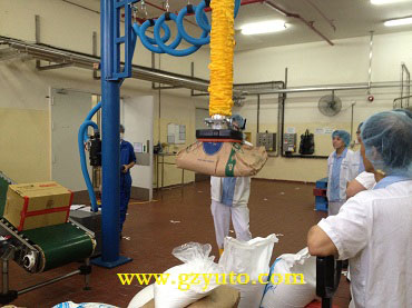 每天將數(shù)以千計(jì)的50公斤重糖袋從卡板搬運(yùn)到輸送帶上, 并且跟上生產(chǎn)的節(jié)拍是一件非常有挑戰(zhàn)的工作。 傳統(tǒng)的辦法就是人力搬運(yùn)。 將工人分成4組, 每組2人, 每30分鐘換班休息。 即便這樣, 仍然會(huì)出現(xiàn)體力不支, 甚至腰部扭傷的工傷事故。